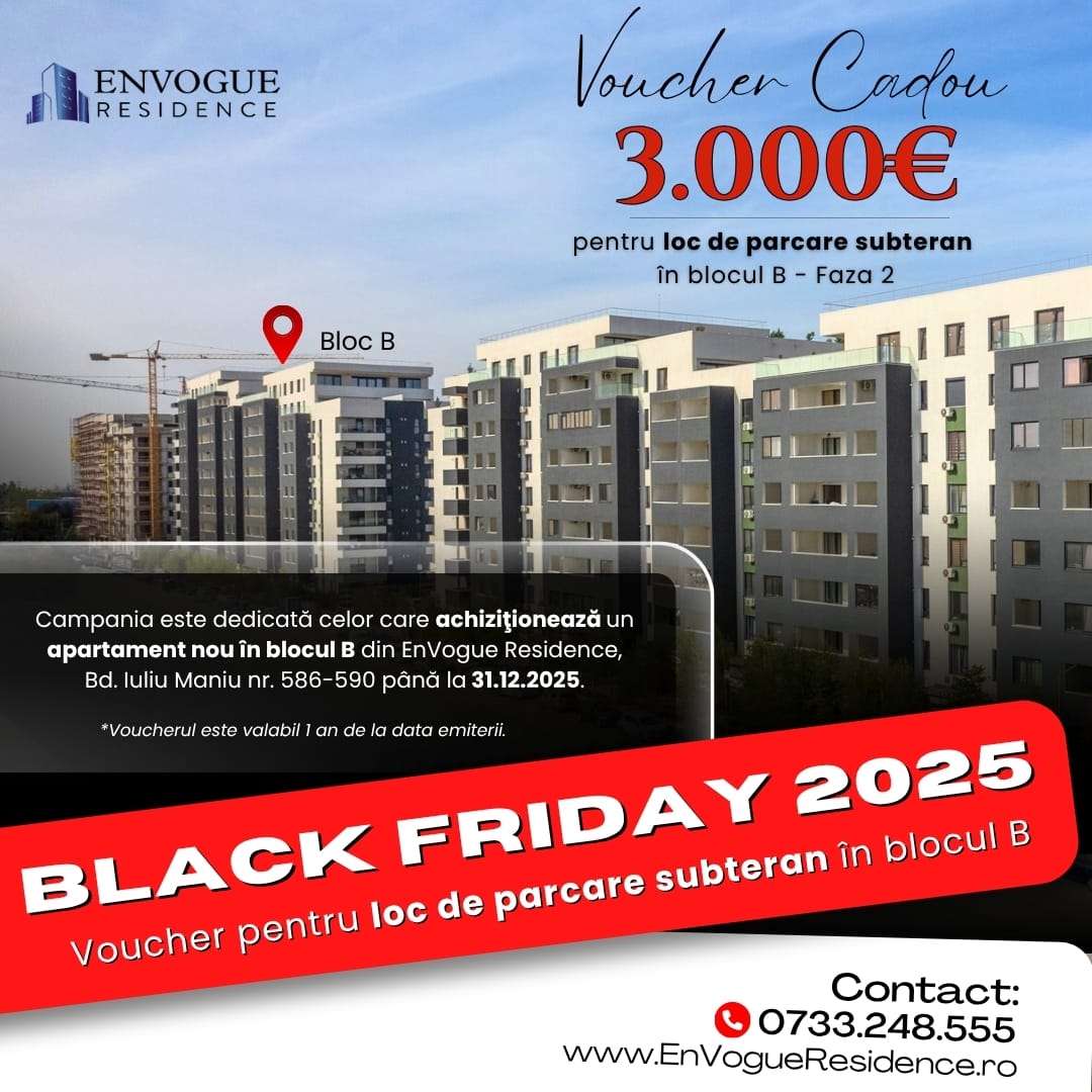 Am lansat o nouă promoție de 𝘉𝘭𝘢𝘤𝘬 𝘍𝘳𝘪𝘥𝘢𝘺, ce constă în acordarea unui voucher în valoare de 𝟯.𝟬𝟬𝟬 𝗱𝗲 𝗲𝘂𝗿𝗼, utilizabil pentru achiziția unui loc de parcare subteran.
