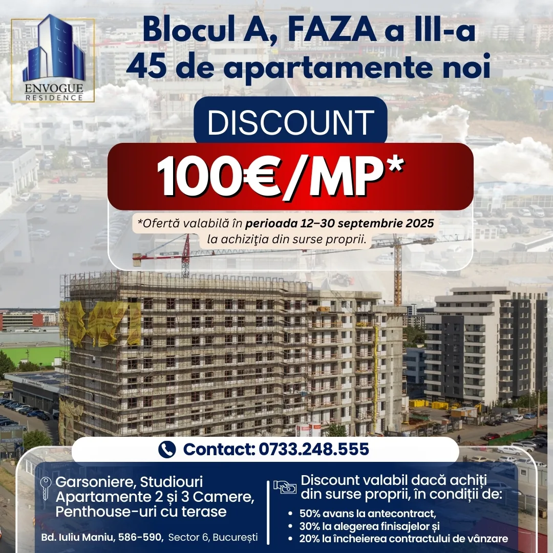 Ai EXTRA REDUCERE de până la 125€/mp la garsonierele de tip 8C si 8D din complexul Envogue Residence Iuliu Maniu Corpul B, din Tronsonul 1 şi Tronsonul 2.